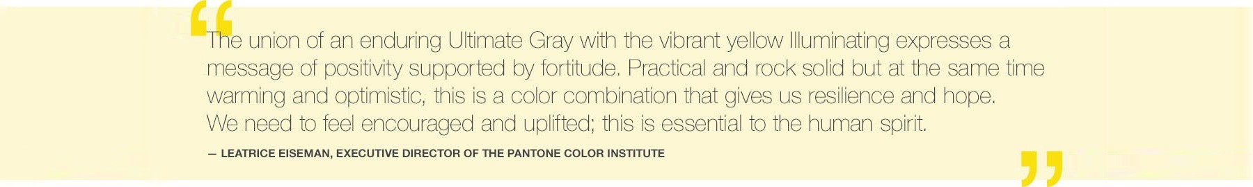 Duurzaam en opbouwend, een boodschap van kracht en hoop: Pantone kiest staalgrijs en zonnig geel als de kleuren voor 2021. "Ultimate Gray" staat voor stabiliteit, kracht en echtheid; "Illuminating", is een hoopvolle, optimistische tint.