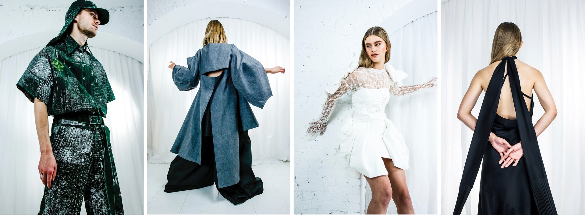 Credits v.l.n.r.: Eva Sonneveld - material Green whisper | Frederieke Broekgaarden - material Spinnova | Hul le Kes x KBCols science | Iris van Herpen. Fotografie: Alina Krasieva